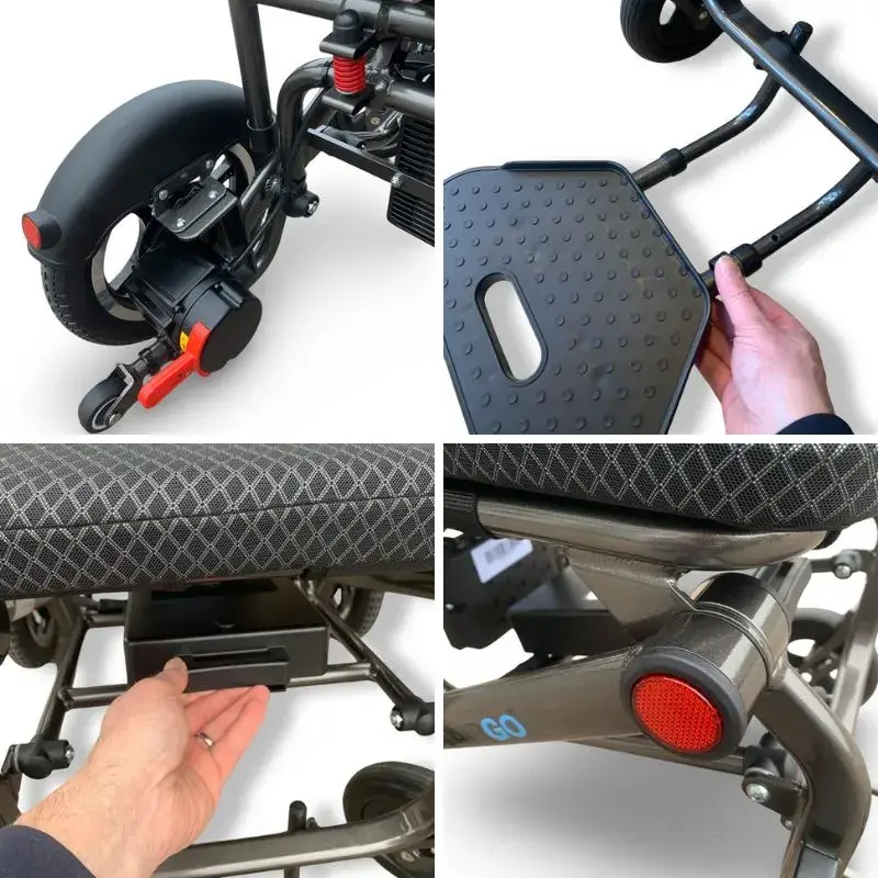 Med sin låga vikt på 18kg, kompakta design och ett lättåtkomligt batteri under sätet, är den mycket smidig att ta med i bilen eller på flygresan. Att fälla ihop den och göra den klar för lastning tar bara några sekunder! Trots sin låga vikt är Airgo S4 utrustad med kraftfulla motorer på 250W och ett batteri som ger en räckvidd på upp till 20km, vilket är fullt tillräckligt i de flesta sammanhang.