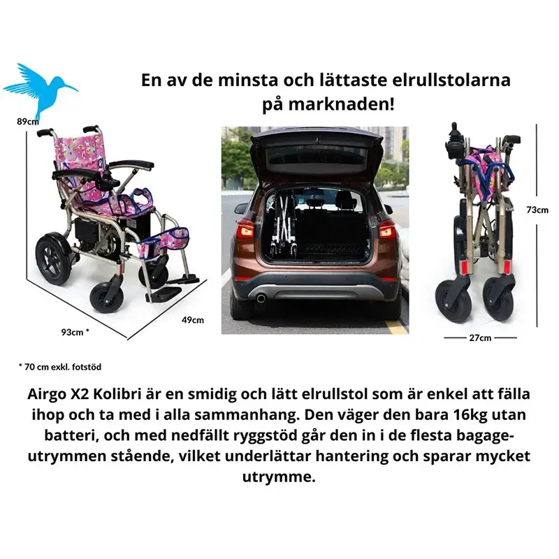 Airgo X2 Kolibri är en liten och nätt hopfällbar elrullstol för barn och unga mellan 7 och 15 år. Med sina stora och breda bakhjul tar den sig enkel fram på alla underlag och är extremt enkel att köra, vilket gör att även mindre barn kan använda den och ta sig runt på egen hand.